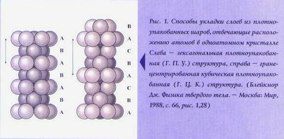 Итак, вернемся к нашим шарикам. Существуют два вида максимально плотных упаковок бильярдных шаров, положенных слоями друг на друга: когда третий слой совпадает с первым – нижним (гексагональная плотноупакованная структура (Г.П.У)) и когда тройки шаров в нем повернуты относительно общего для них центрального шара (во втором слое) на 1/6 часть окружности (гранецентрированная кубическая (Г.Ц.К)) плотноупакованная структура.