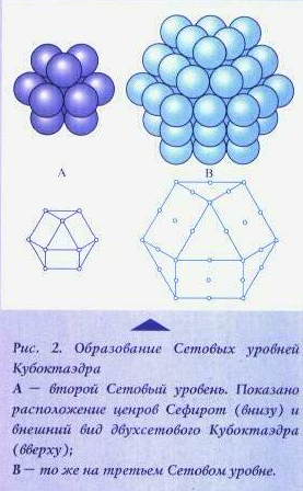 Генерируя Кубоктаэдр, Кетер «одевается» в слои Сефиротных оболочек – Сетовых уровней.(см. рис.2-4) При этом Кетер нерасчлененно препосылается свой сетовый уровень – первый. Кетер, «одетая» в одну оболочку из Сефирот, окружившая себя 12 Сефирами, совместно с ними образует двухсетовый Кубоктаэдр. Далее этот Кубоктаэдр (как и все остальные) последовательно свертывается в обратном порядке.