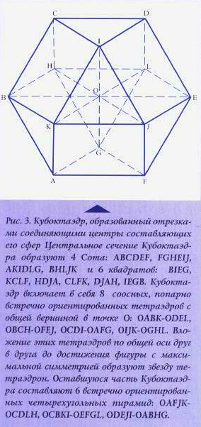 И здесь кроется секрет Кристалла нашего Универсума – Кубоктаэдра. Первой активируется Сфера, являющаяся центром, вокруг которого проявятся окружающие (плотно прилегающие к ней) 12 Сфер – Вселенных. Центральная Сфера (Сефира Кетер, Корона, см. опубликованную в первом номере мою статью «Выбор за каждым из нас» (в дальнейшем – первая статья)). Кетер для своего окружения (соприкасающегося с ней непосредственно или через последовательность слоев) служит Истоком и проводником Всего Сущего, отражающего Высшие Аспекты непроявленного. Начинается наращивание энергетических Сфер-Вселенных (Сефирот), слоями охватывающих центральную группу Сфер, окружающих свой Первоисток. Но только в случае Г.Ц.К.–структуры при центральном наращивании оболочек образуется наиболее экономичная симметричная фигура – Кубоктаэдр, лежащая в основе миропорождающих пространств. (см. рис 2 и 3).