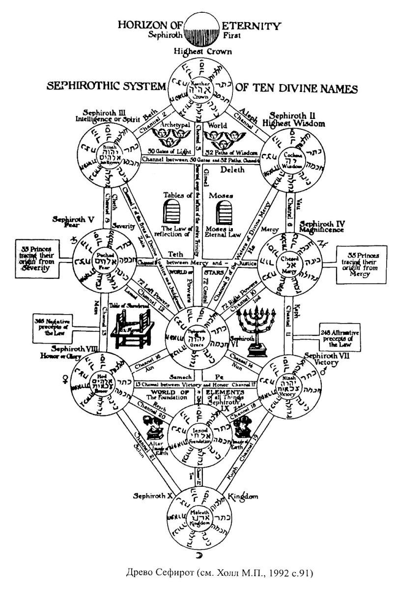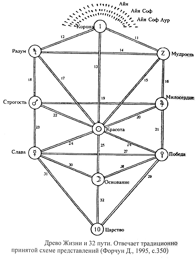 Соединительные линии, показанные на схемах, символизируют "Пути", эволюционно связывающие между собой отдельные Сефирот (множ. от Сефира) - замкнутые "Вселенные", содержащие бесчисленные "внутренние миры". При этом используется традиционно принятая каббалистическая терминология.